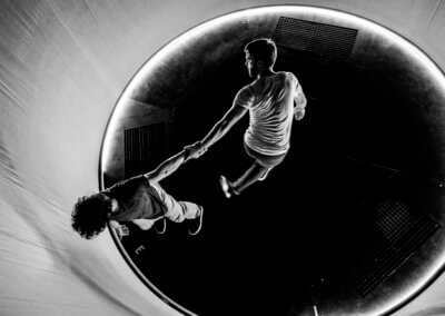 Depuis des années, Jean-Camille Goimard suit les exploits des « wing-suiters » qui s’élancent du haut des montagnes vêtus d’une combinaison ailée. fasciné par les sports extrêmes et nourri de photographies et vidéos qu’il a récoltées, il s’est inspiré de la gestuelle de ces base-jumpers mais aussi de leurs témoignages et de leur philosophie de vie. En résulte un spectacle à 360 degrés. Sur scène, deux danseurs évoluent dans une structure cylindrique rappelant un simulateur de chute libre, sur laquelle sont projetées des images vidéo. restituant la quête de liberté de ces hommes chauve-souris, mais aussi leurs sensations face au vide, ils nous plongent en apesanteur et donnent corps au plus vieux rêve de l’humanité.